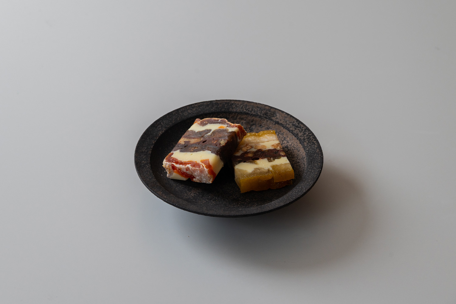干柿の濃厚な甘み、無花果のやさしい食感、胡桃の香ばしさ。 それぞれの素材が重なり合い、奥深い味わいを生み出します。 甘さを抑えたホワイトチョコレートとビターチョコレートが調和し、 ひと口ごとに広がる豊かな余韻。 五感で愉しむ、一善やを象徴する逸品です。