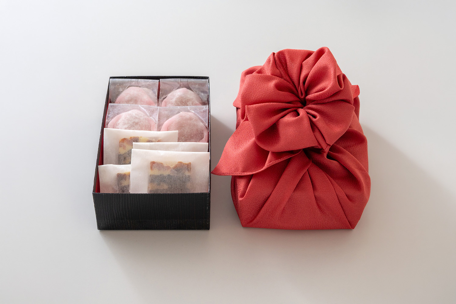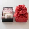 「一善や」では、贈り物の最後を彩る『風呂敷包み』をご用意しております。 ご贈答に華を添える風呂敷包み(オプション)は、伝統の結びをアレンジしたオリジナルの花結び。 6色(ローズ、古代紫、柚子、抹茶、鉄濃紺、藤)の中から、 お気持ちや季節に合わせてお選びいただけます。 想いを込めた洋菓子を、やわらかな風呂敷に包み、さらに美しくお届けいたします。