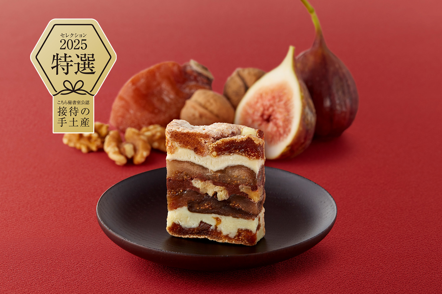 株式会社ぐるなびが運営する「こちら秘書室」公認 『“接待の手土産”セレクション2025』にて、 「特選」をいただいた極上の一品です。五感で感じる五重奏の美味しさは、5つの素材を8層に重ねることで生まれました。国産無花果の心地よいつぶつぶ感、干柿のねっとりとした自然な甘さ、胡桃のカリっとした食感、そして甘さを控えたホワイトチョコレートとビターチョコレートの5素材で構成しています。味も食感もまるで交響曲を聴いているような立体的な美味しさです。一口目の感動をぜひご体験ください。